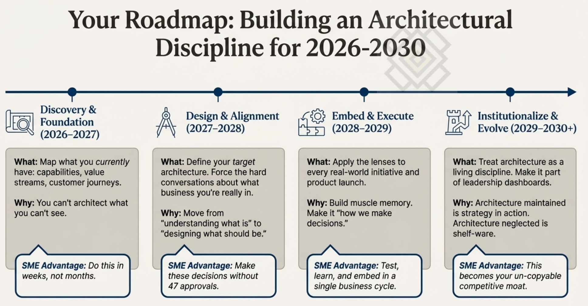 By 2030, operating with architectural clarity won’t be an advantage — it will be table stakes. The businesses thriving then will be the ones who built this mindset in 2025–2027, before the pressure hit.