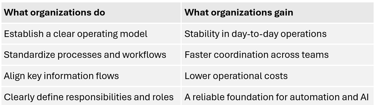 However, if tools are introduced before a coherent model exists, fragmentation appears: disconnected systems, employees who don’t know where information lives, and time lost in friction.
