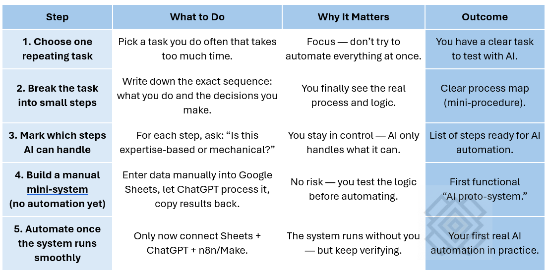 Prototype: Start with free or open-source tools (ChatGPT free tier, open models, Make’s free plan) to validate logic.
