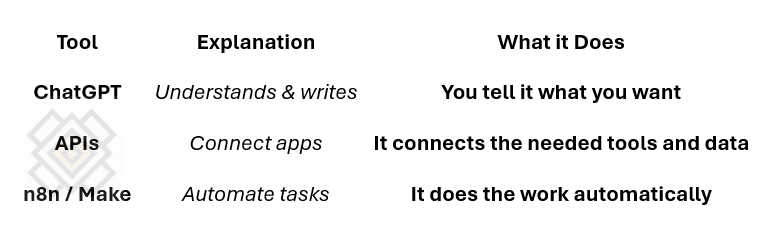 Tools like n8n, Make, and ChatGPT (API) are available to everyone.